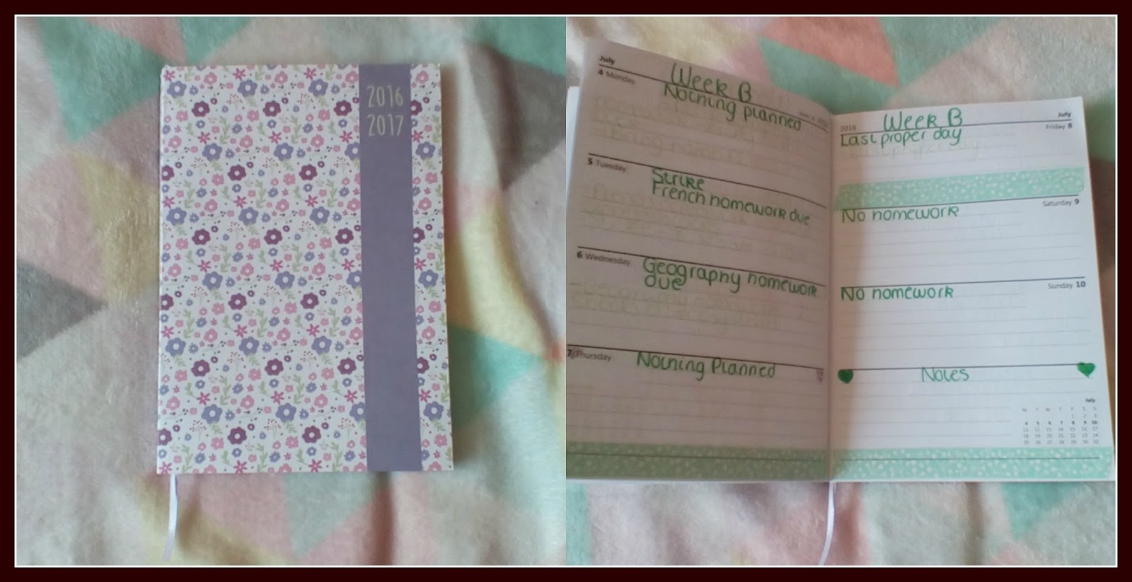 Candy Blossom 2016/17 Mid Year Diary from Tesco- This is my school planner and it's the only one that's not ringed but I don't mind as I quite like the Tesco pages as I've used them for a while. When I'm writing this it's the summer holidays so I haven't used this for a while but when the school year starts again I will definitely helped me as this did help me in the last few weeks of year 9.